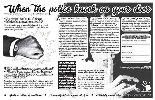 In cooperation with legal counsel, our comrades have prepared a poster explaining how to handle visits from law enforcement. This includes any agent from any law enforcement agency, regardless of whether they are local, state, or federal, including the FBI, ATF, and ICE when they are working as law enforcement, uniformed or not. Consider putting a copy of this poster by the doors of your residence and familiarizing yourself with the information. These days, no matter who you are or what you’re doing, you never know when you might receive an unwelcome visit.